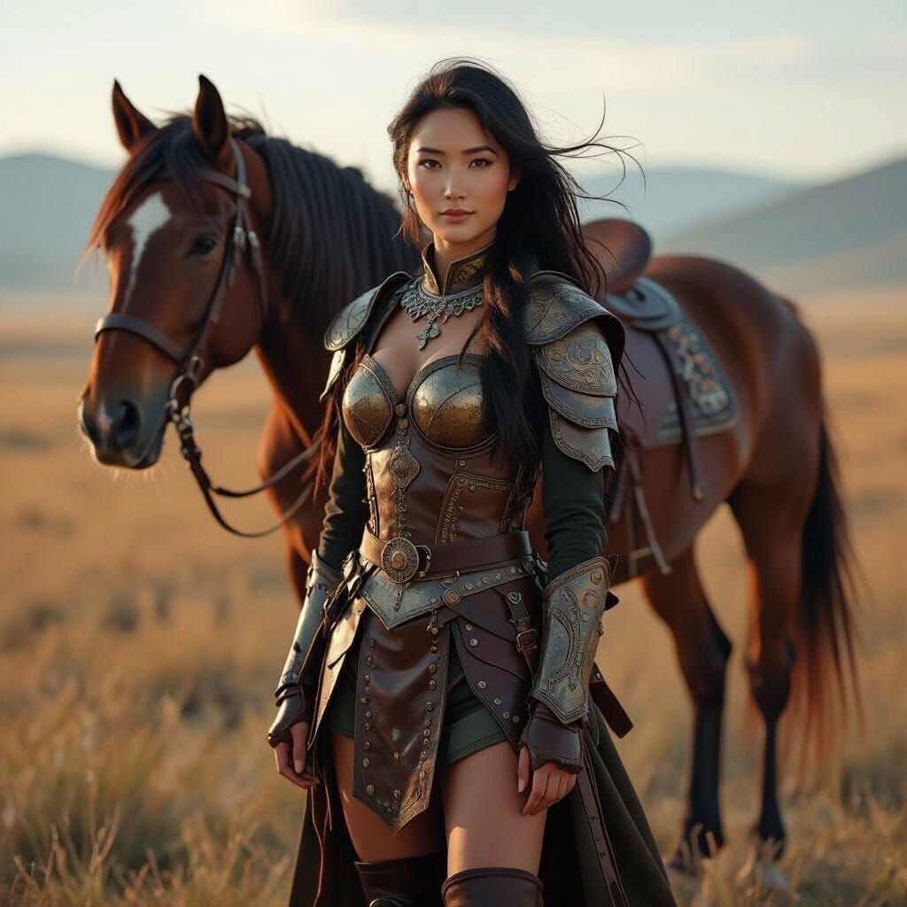 This image shows a young Mongolian woman in traditional leather armor standing next to her war horse. Captured in soft morning light, the photorealistic scene features intricate details and deep, complementary colors.