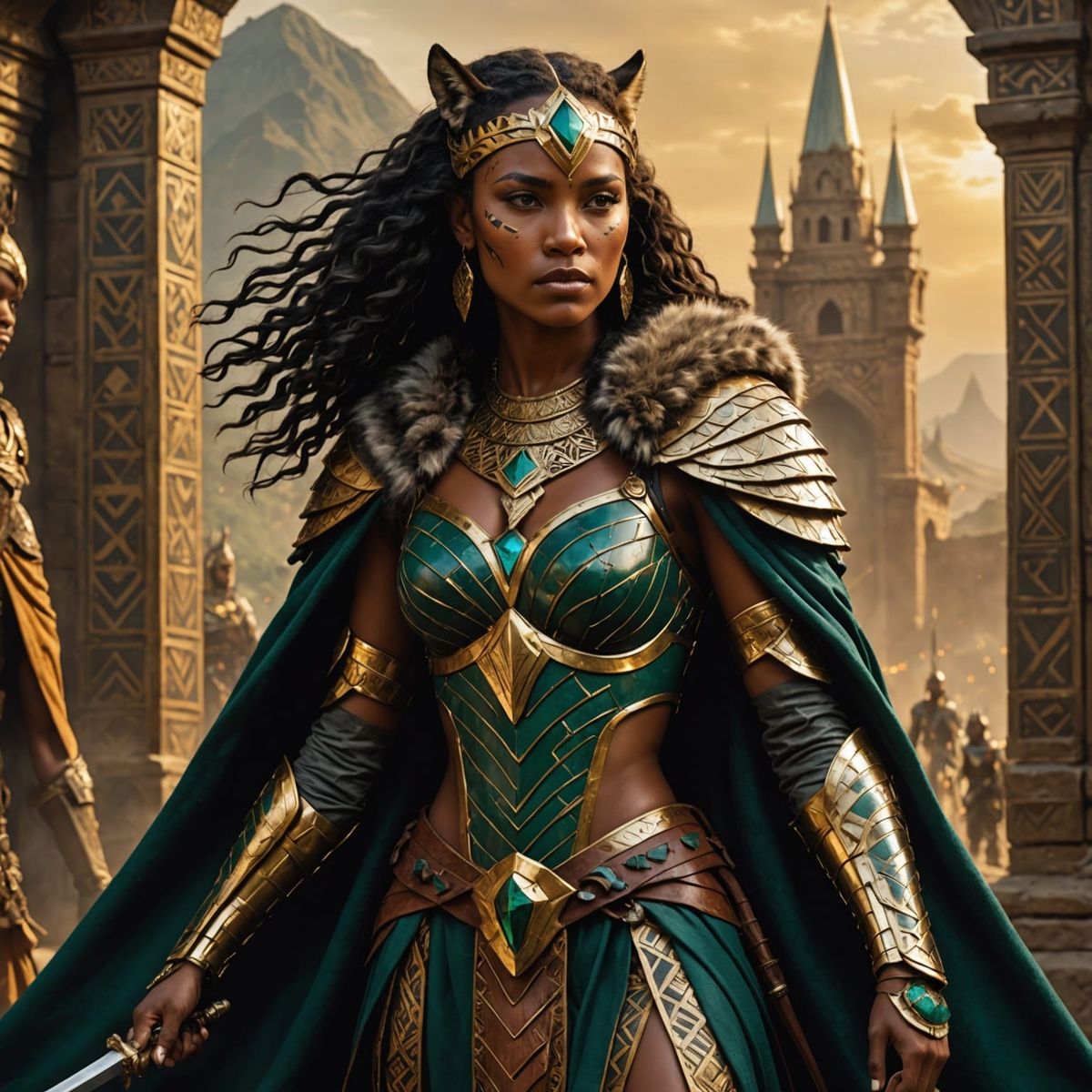 A striking picture of an Amazonian warrior princess ready for battle. She is clad in gilded leather armor with a panther-fur cloak, rendered with thick brushstrokes and tropical chiaroscuro.
