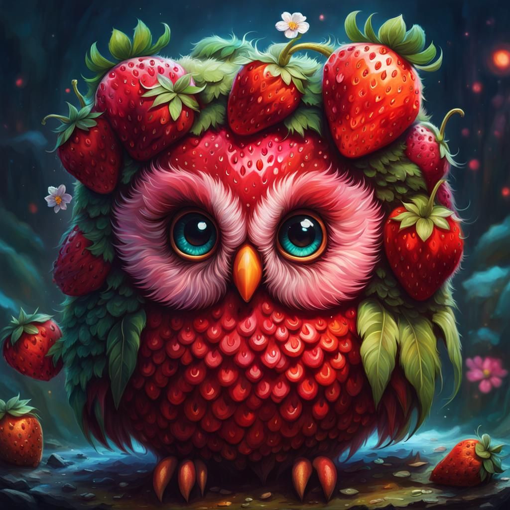 A vibrant image of a fluffy strawberry owl with glowing eyes. The artwork features a detailed, colorful and fantastical design, reminiscent of fantasy art album covers in ultra-high resolution.
