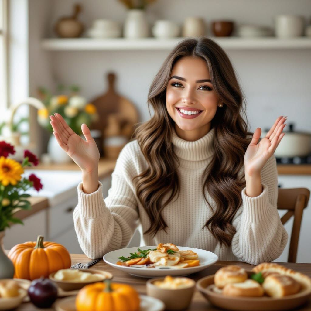 Generate unique Thanksgiving images featuring pretty women and festive scenes with our free AI tool. Easy and fun!