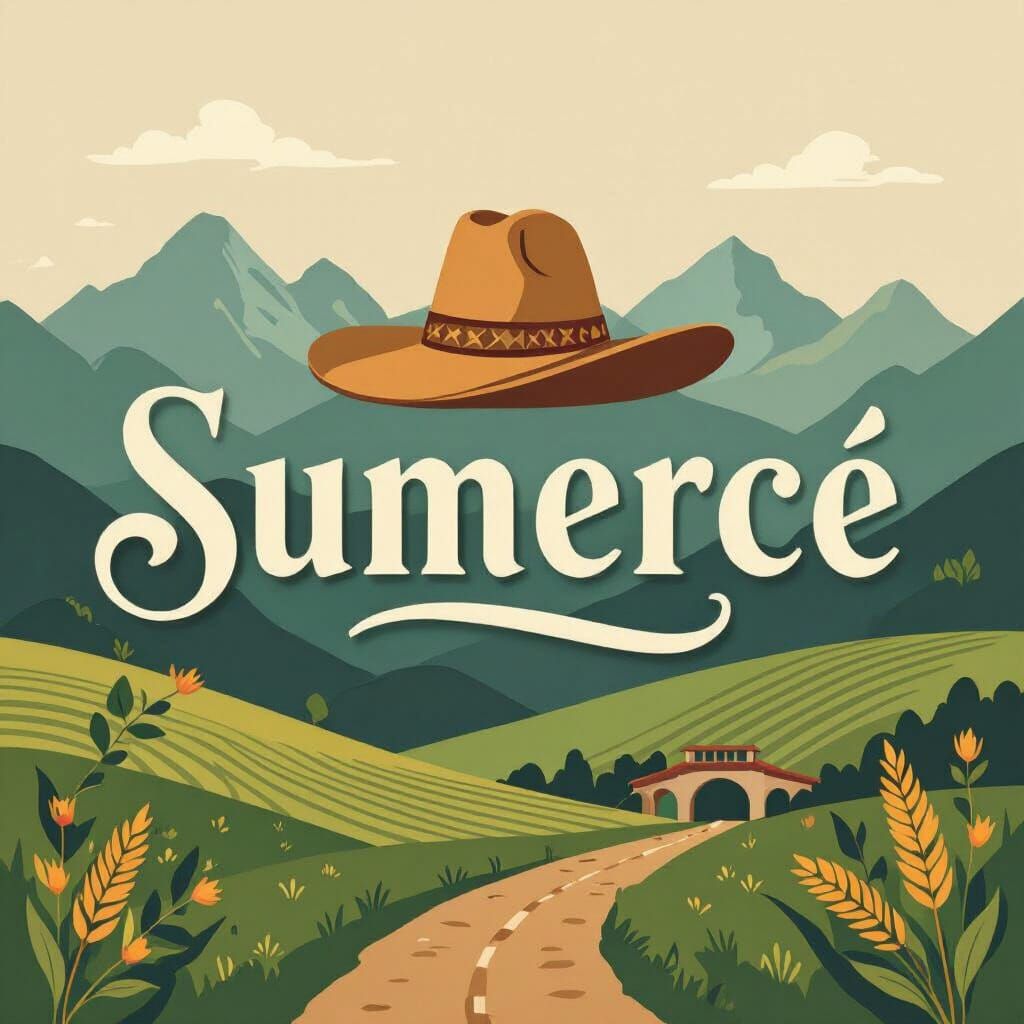 A calligraphic depiction of the word "Sumercé" set against a landscape of Boyacá, Colombia, featuring rural scenery and cultural elements in the style of Latin American masters.