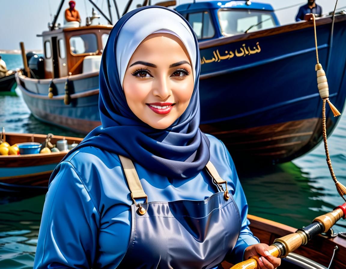 A realistic portrait of a beautiful, curvy, middle-eastern fisherwoman with fair skin and an elegant smile, standing on a fishing boat in natural light. The image is hyperdetailed and ultrarealistic.