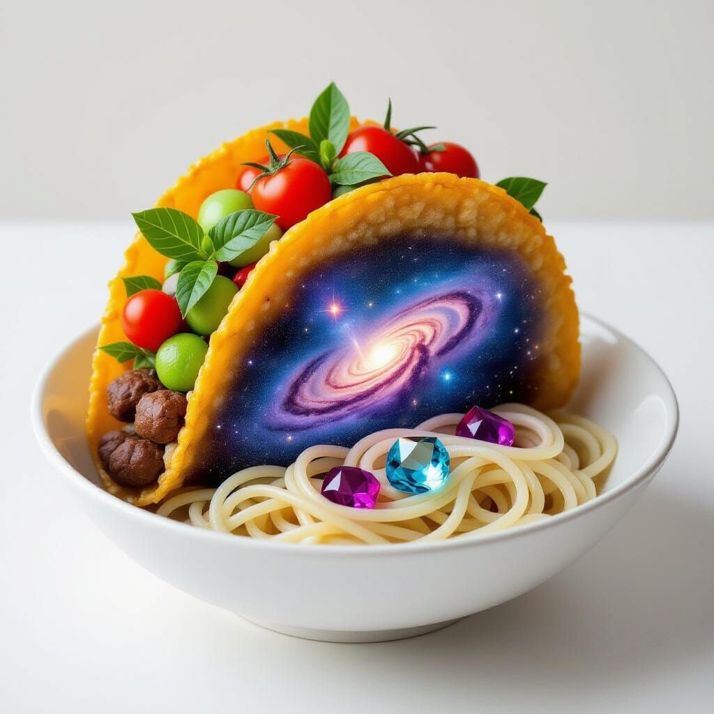 This image shows a creative reimagining of familiar foods using unexpected materials. The concept focuses on texture and structure, presenting dishes like tacos made from nebulae and cakes formed from gemstones.