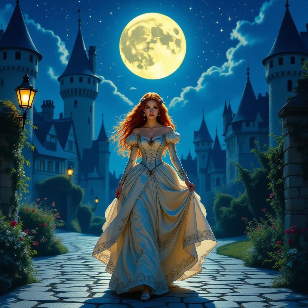 This image depicts a young witch with red hair, adorned in an ornate princess gown, walking through a medieval castle courtyard. The scene features a luminous full moon and is rendered with rich jewel tones and cinematic lighting.