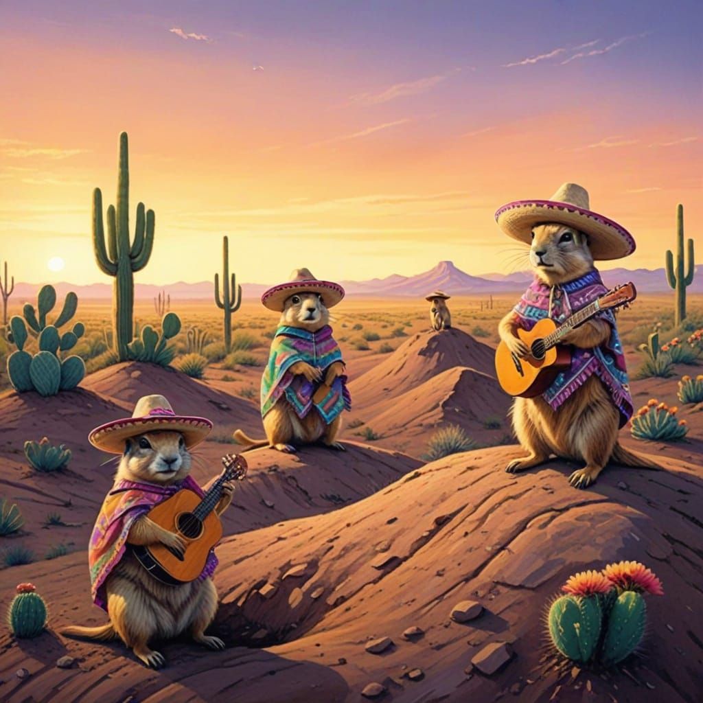 "Three Prairie Dogs wearing vibrant colorful sombreros and traditional colourful Mexican ponchos, all :standing away from each other on separate dirt mounds: Standing proudly on top of their own separate dirt mound above holes they’ve dug in a dry desert landscape. :Two of the Prairie Dogs are playing ...