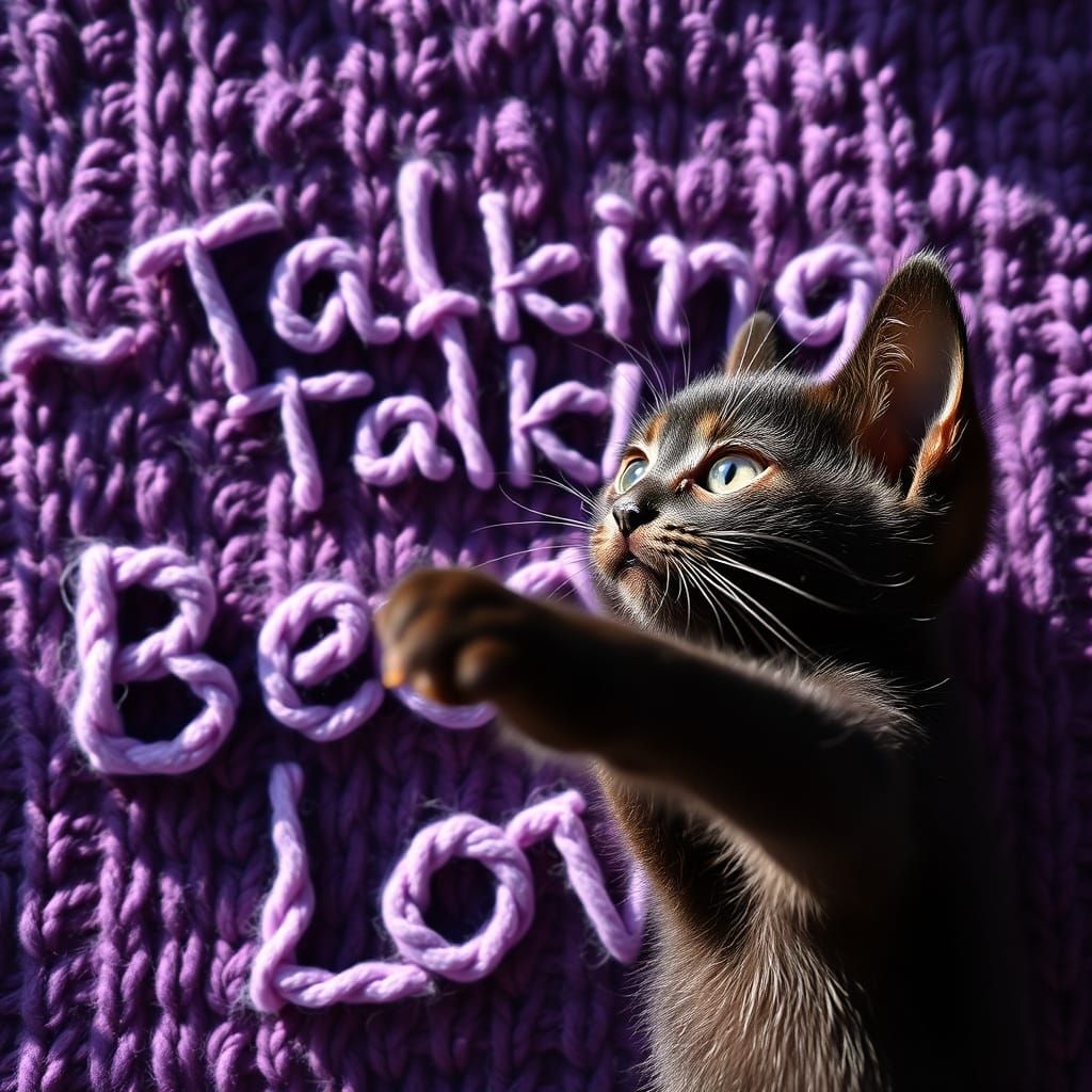 This image shows a black kitten playing with purple yarn that spells out "Talking Becca Love" on a textured wool backdrop. The macro lens captures the sunlit studio setting.
