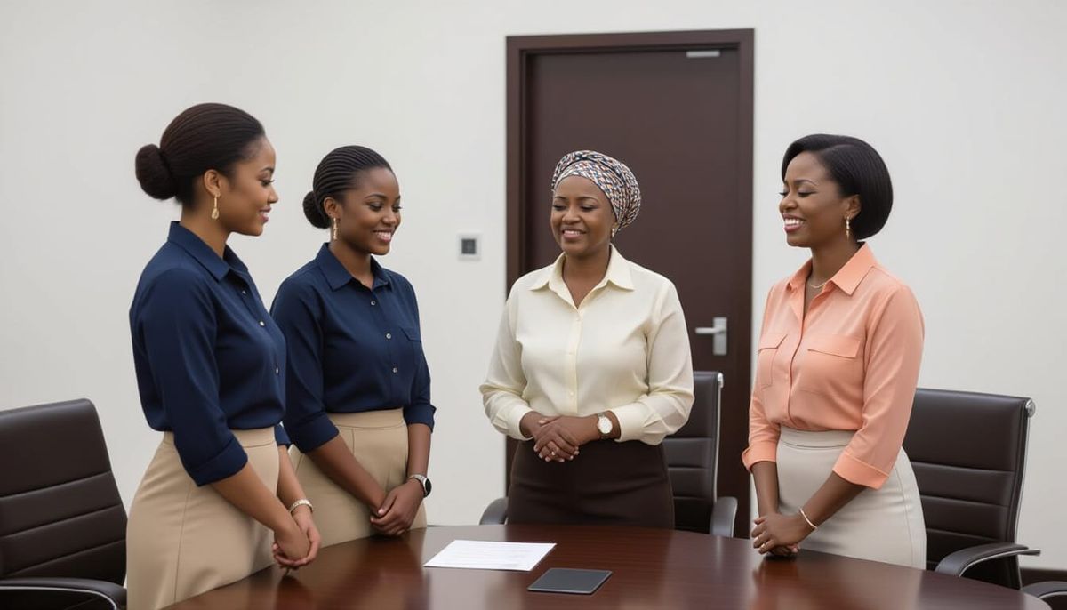 This image depicts a dramatic and emotional moment in a modern Abuja law firm, captured with realistic lighting and photorealistic detail. The scene conveys deep introspection and somber reflection.