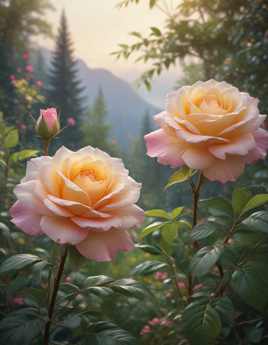 This enchanting watercolor painting features a lush garden of blooming roses in soft, warm colors, set against a misty mountain backdrop with elegant calligraphy and delicate details.