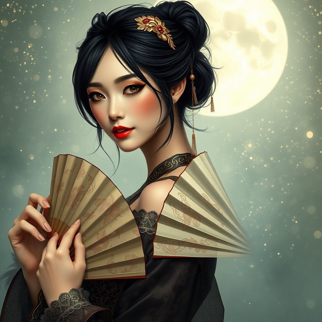 This image shows a mystical woman with raven-black hair, adorned with a golden hairpiece, posing with Chinese fans in a misty, glittering background. She wears a luxurious, imperial dress with intricate patterns, exuding elegance and mystique.
