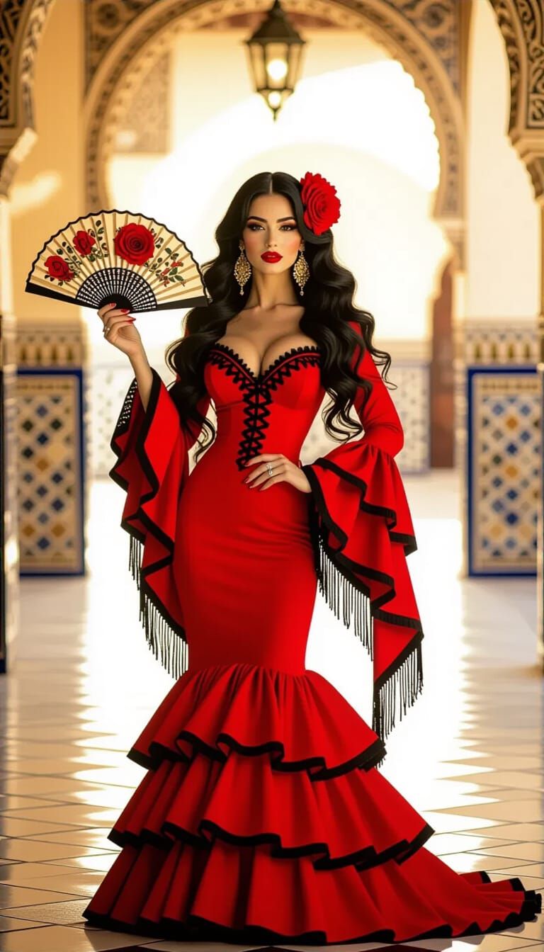 This image shows a striking Spanish woman in a red flamenco dress holding a fan. The portrait evokes dramatic elegance with golden light, Andalusian arches, and a cinematic atmosphere.