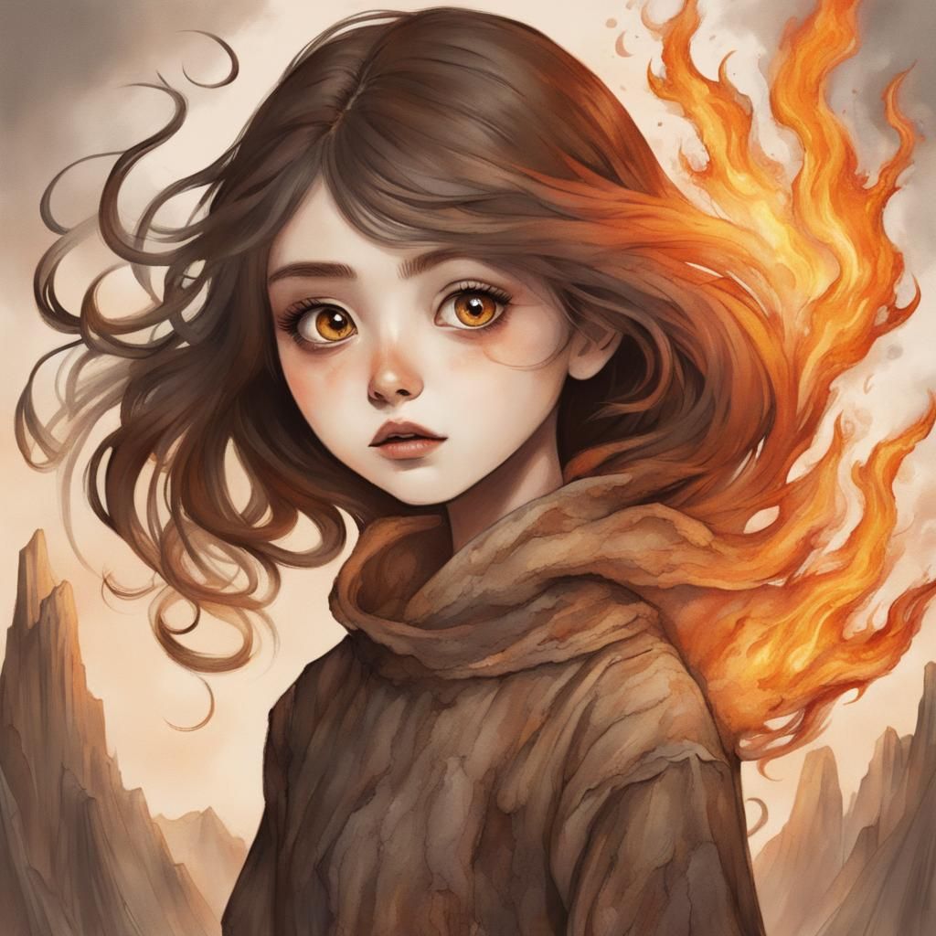 This image shows a girl with big, expressive eyes. Her eyes are uniquely designed to resemble a captivating blend of fiery flames and earthy textures.