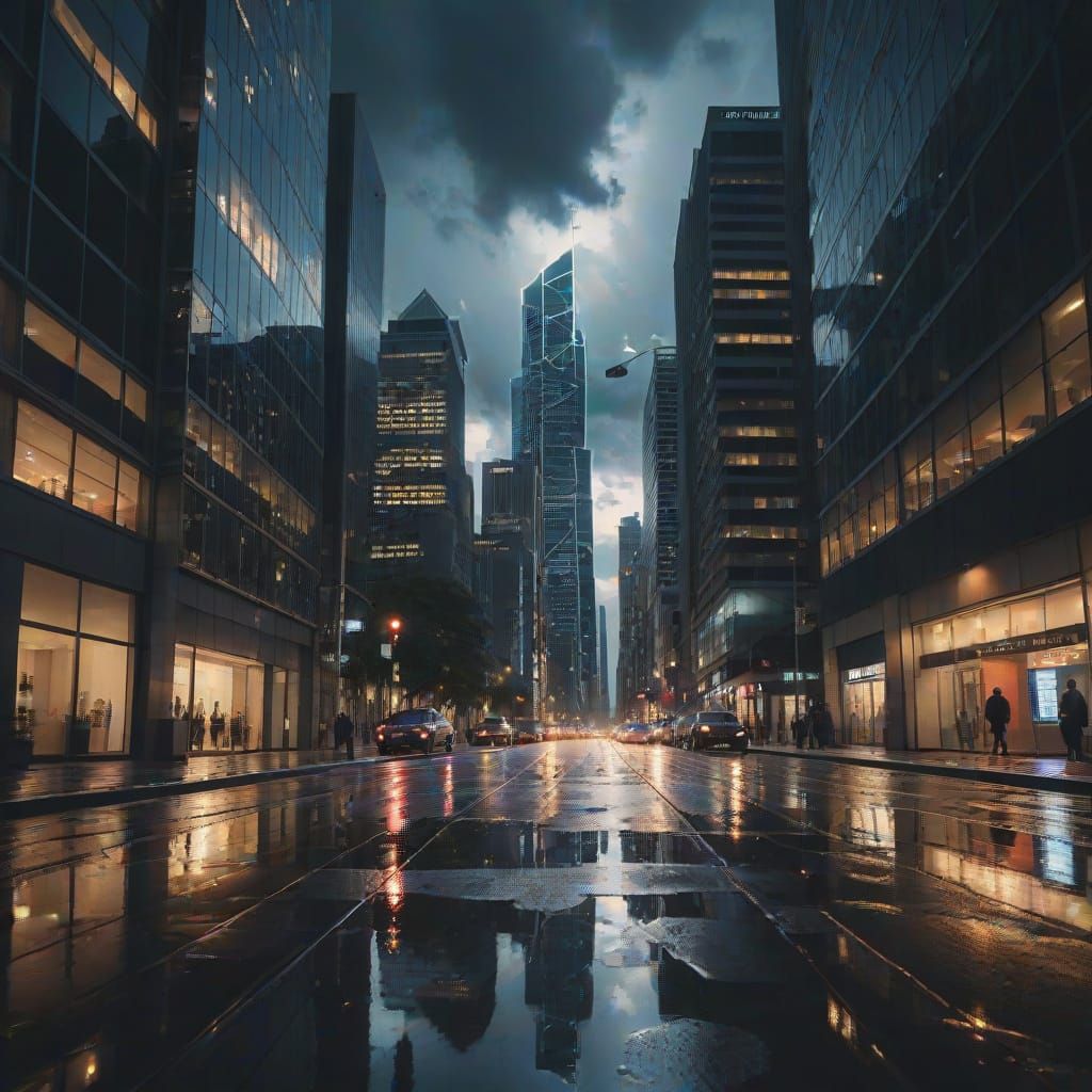This image shows a hyperrealistic, low-angle view of a city at dusk. Skyscrapers with reflective glass facades shimmer under lightning-illuminated clouds, casting deep shadows on dark, wet streets.
