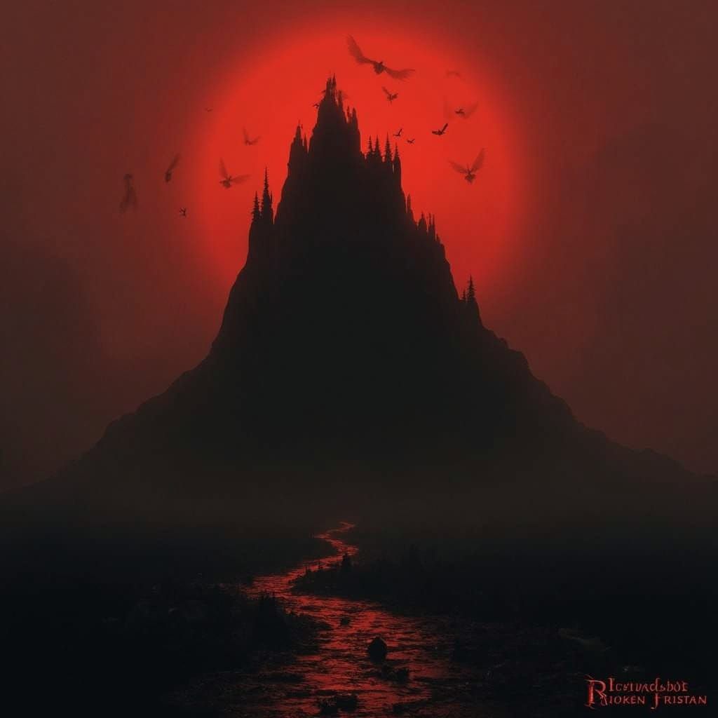 A chilling silhouette of a hill emerges from a dark, foggy landscape. The red sky blends into black mist with subtle skull patterns. The artwork evokes a blend of haunting etchings and atmospheric horror.