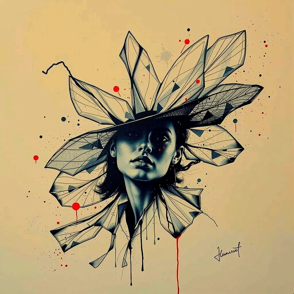 This striking black and white portrait features a woman wearing an artistic hat, her face partially hidden by shadow, with a single, vibrant crimson color accent.