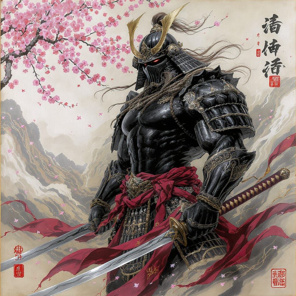 A hyperrealistic oil painting of a powerful samurai in detailed, weathered armor and crimson robes, holding a katana amidst cherry blossoms. Inspired by Japanese art and fantasy.