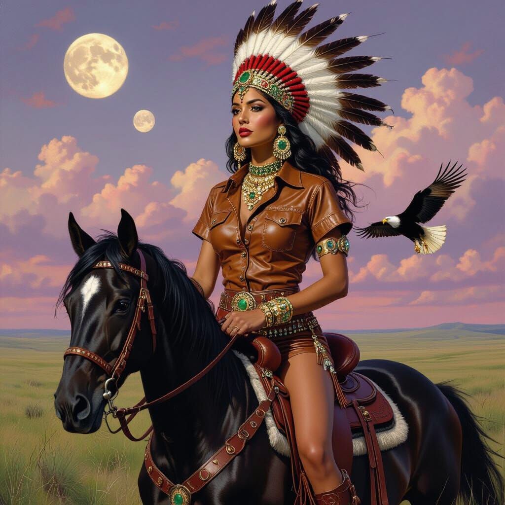 A striking picture of an Indian woman in leather attire riding a rearing black horse across a prairie. An eagle soars nearby under a vibrant sky with two moons, rendered with dynamic textures in a fantasy art style.