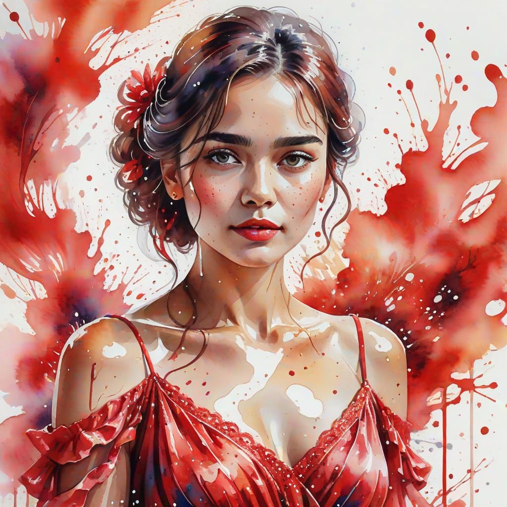 This watercolor portrait features a beautiful lady in a dress with bold brushstrokes and vibrant red hues, set against a dreamy atmosphere with intricate vector elements and detailed studio lighting.