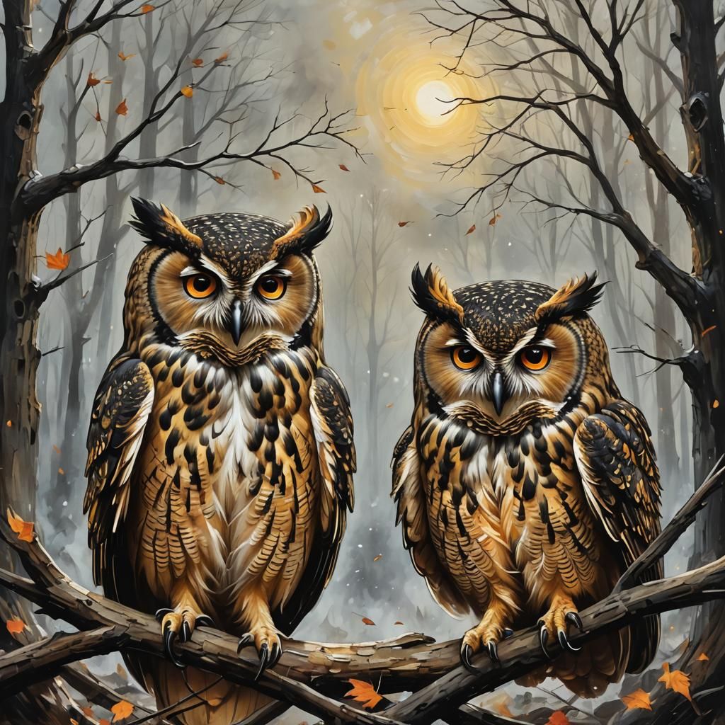A vibrant matte painting of a mountaintop owl habitat, filled with nests and colorful emotional expressions. The artwork is highly detailed with complementary colors in a fantastical style.