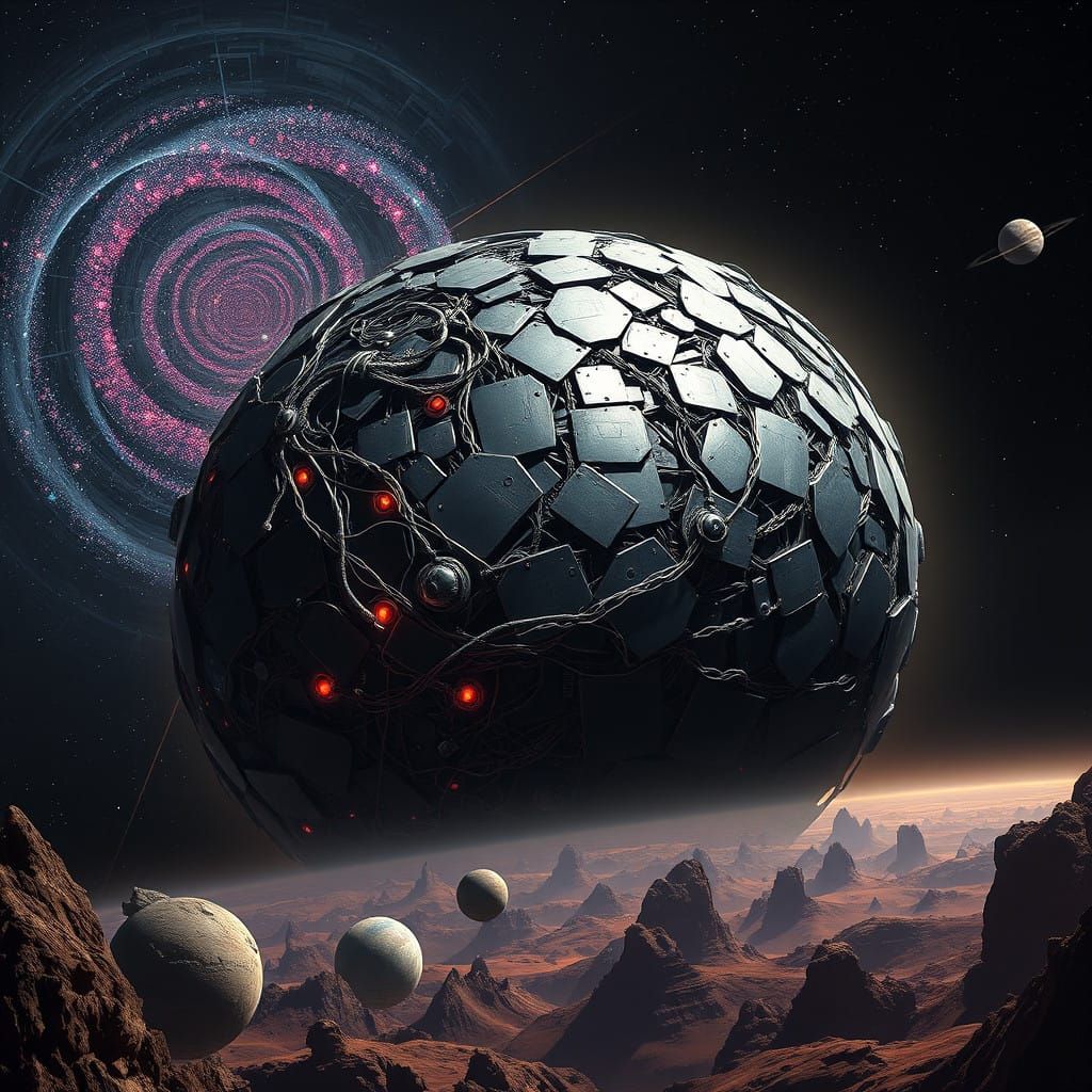 This image depicts a colossal, malevolent planetoid with a twisted cybertronic exoskeleton, looming over smaller Star Wars planets in a dark, ominous scene, blending traditional and sci-fi elements with hyper-detailed graphics.