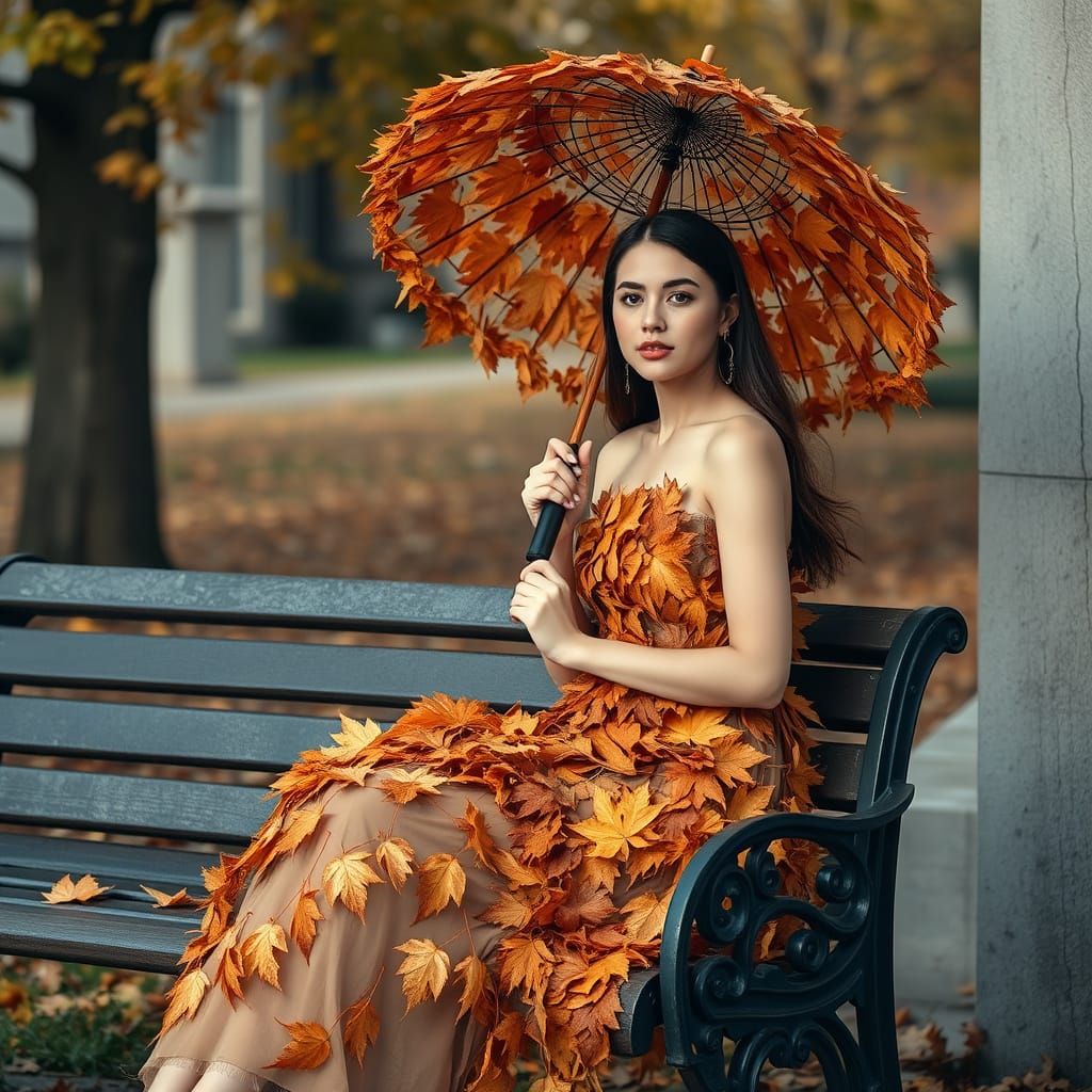 A beautiful woman in a leaf dress sits on a bench holding an umbrella crafted from autumn leaves. The image features a golden theme with warm orange and brown tones, evoking a sunny autumn atmosphere.