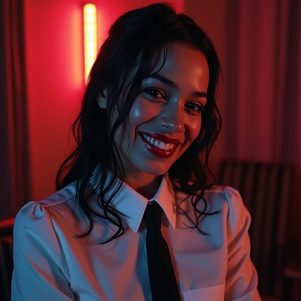 This image features a politician with bold, contoured features and vibrant, blood-red lips, exuding confidence in a dimly lit, horror-themed room with pulsing neon lights, reminiscent of a Tim Burton-esque gothic realism style.