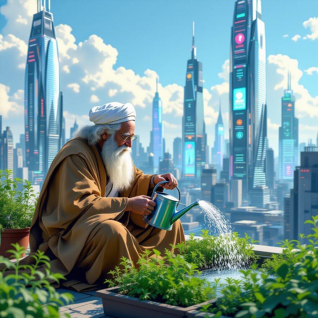 A striking picture of an elderly man tending a rooftop garden. The scene is set against a futuristic cityscape with gleaming skyscrapers and holographic advertisements, in a whimsical style.