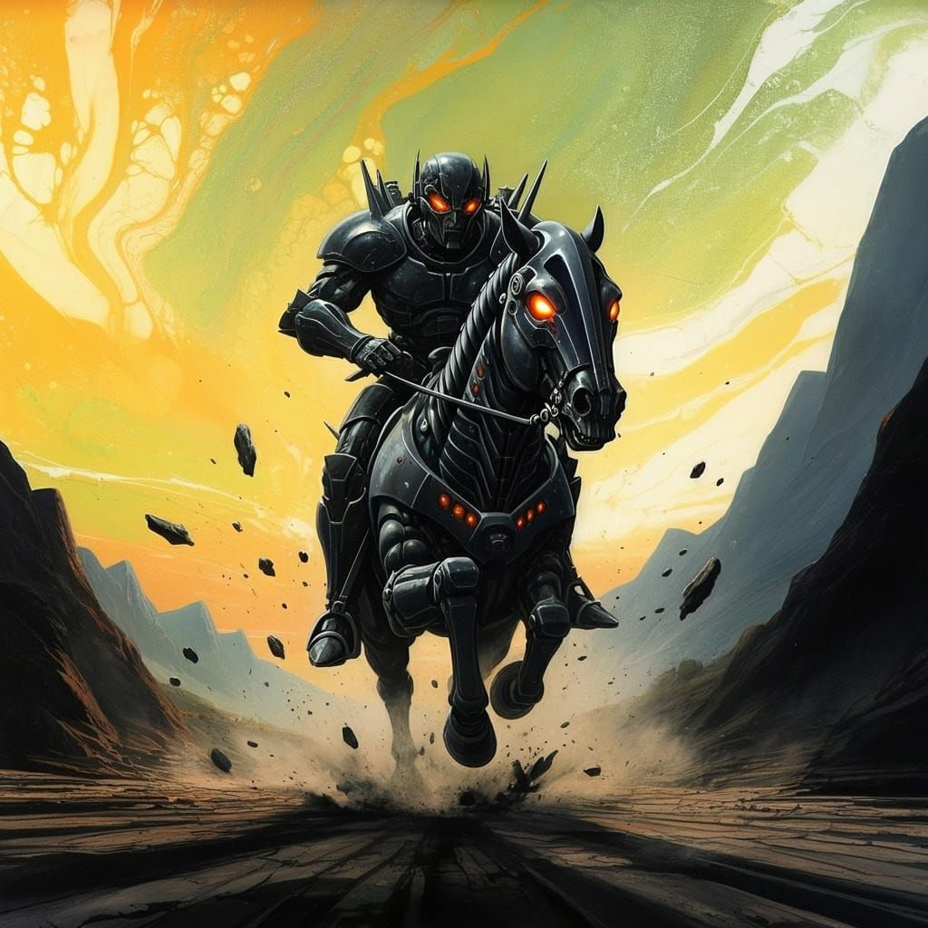 A striking image shows a futuristically armored warrior on a cyborg horse charging forward. The scene is rendered in an airbrushed style reminiscent of 1970s science fiction book covers, with a marbled sky and spattered paint.