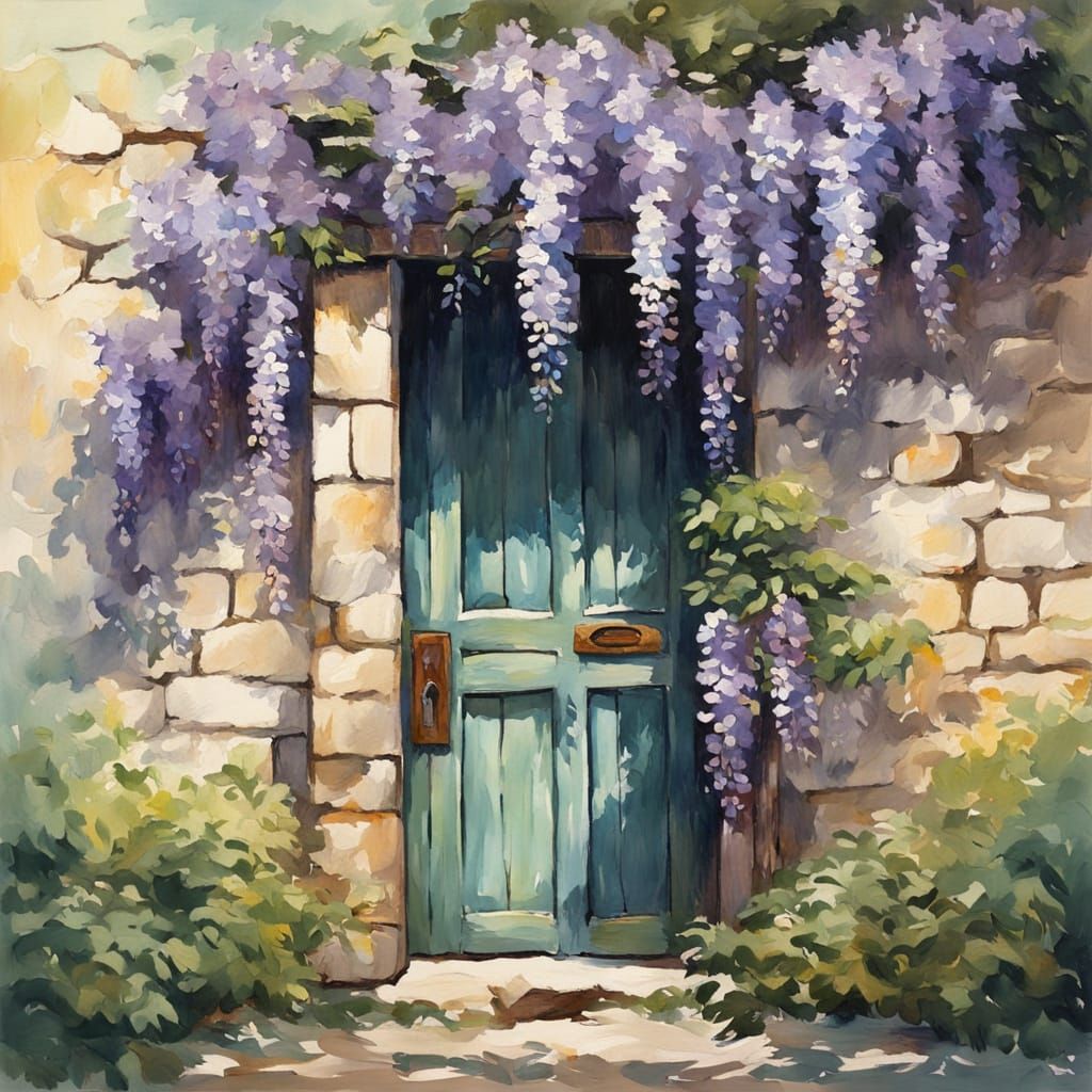 This vibrant painting depicts an old oak door adorned with wisteria, set against a weathered stone wall, created in a bold Impressionist style with thick brushstrokes and textured gouache layers.