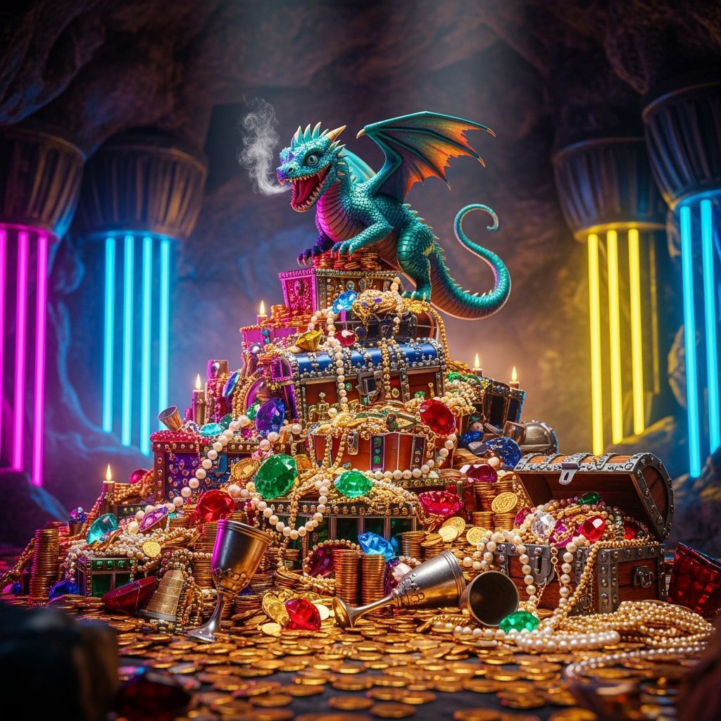 A striking picture of a young dragon protecting a pirate's treasure. The scene has a baroque sense of drama with futuristic detailing and neon mysticism.