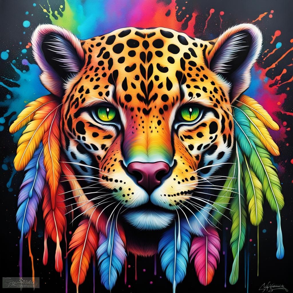 A vibrant graffiti art image depicting an ayahuasca jaguar surrounded by stars, feathers, and rainbow colors. The artwork features high contrast, colorful polychromatic elements, and ultra-detailed textures.