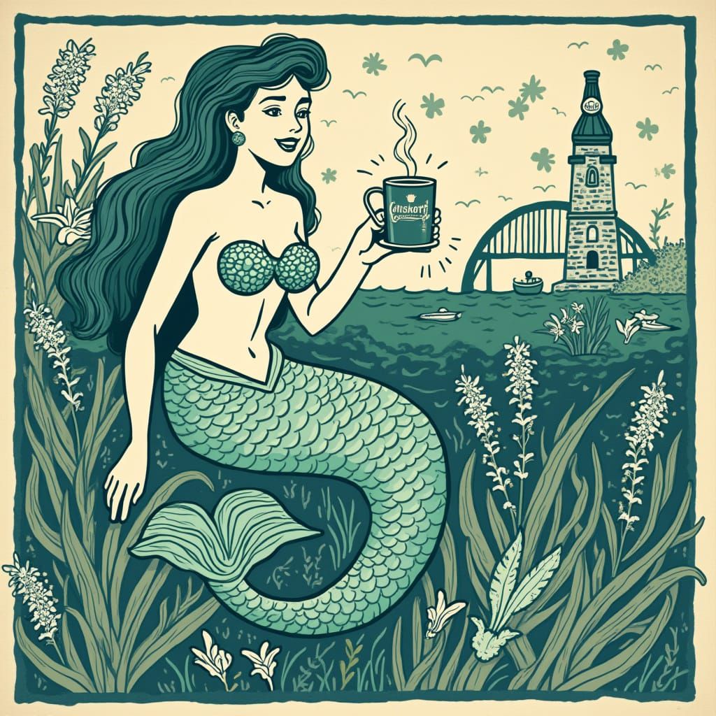 This image is a stylized, flat illustration of the Little Mermaid holding a coffee cup, set against the vibrant colors of Aarhus' rainbow bridge, surrounded by flowers and nostalgic Danish details, in a retro 1950s aesthetic