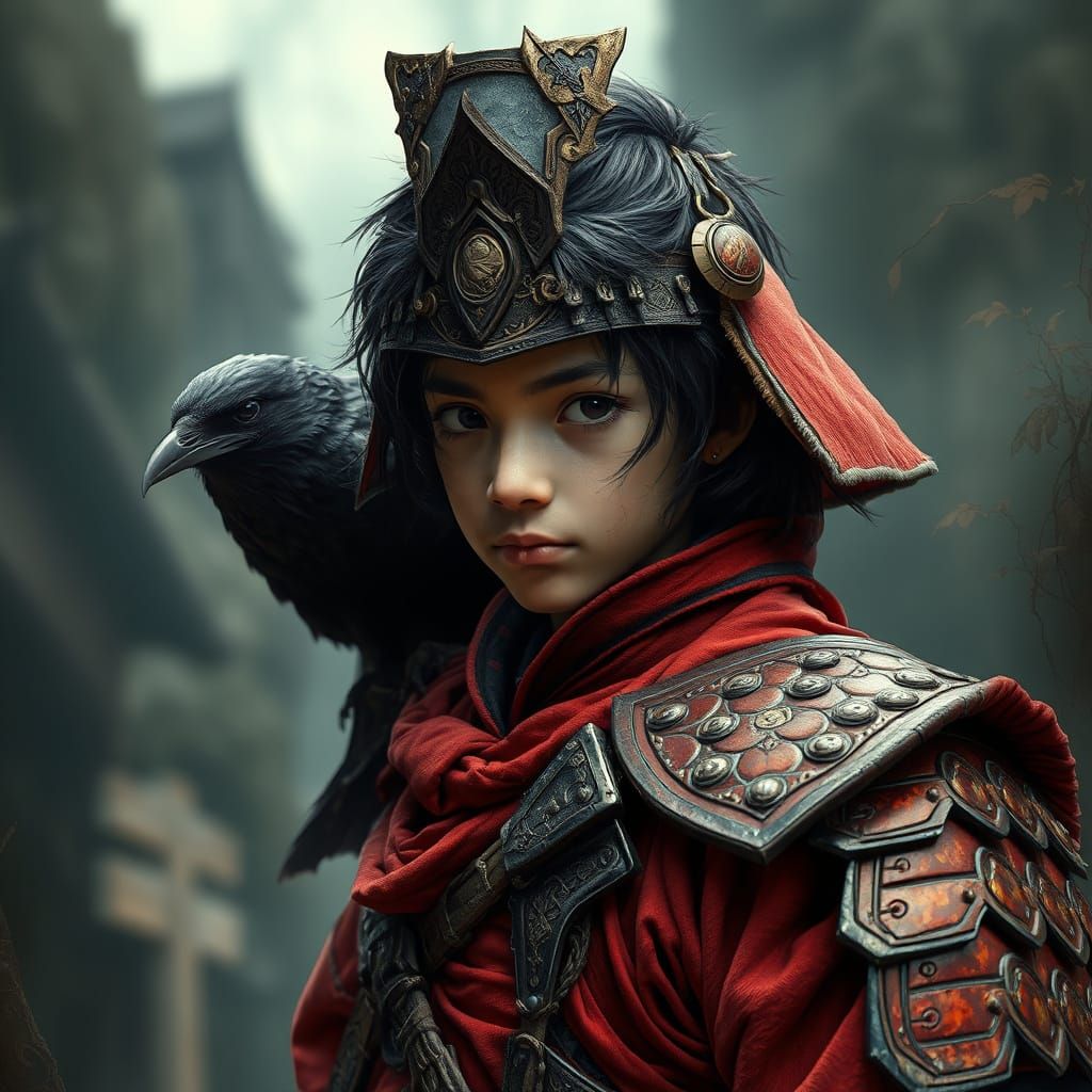 This image shows a samurai with a raven on their shoulder, rendered in a dark fantasy style. The artwork features intricate details, dramatic lighting, and a shallow depth of field.