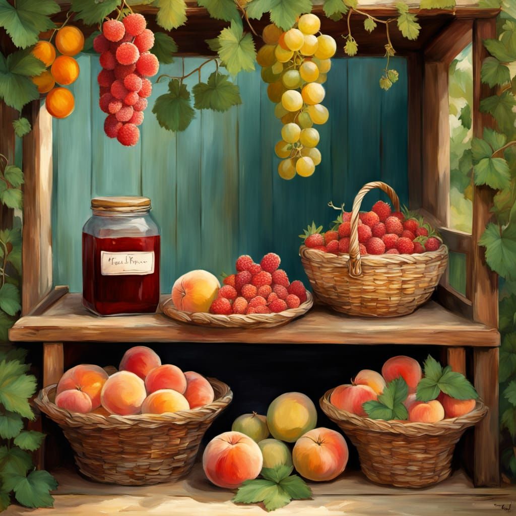 A vibrant impressionist painting of a farmer's kiosk adorned with garlands at dusk. The kiosk displays watermelons, melons, grapes, and other fresh produce under a warm, golden light.