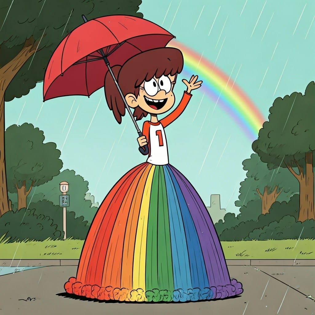 The Loud House Cartoon Style: Lynn Loud wearing a red and white shirt with a red 1 and long red raglan sleeves and a large long floor length poofy rainbow dress. The skirt is made up of vertical panels of tulle in various shades of red, orange, yellow, green, blue, and purple. She is holding a big umbrella ...