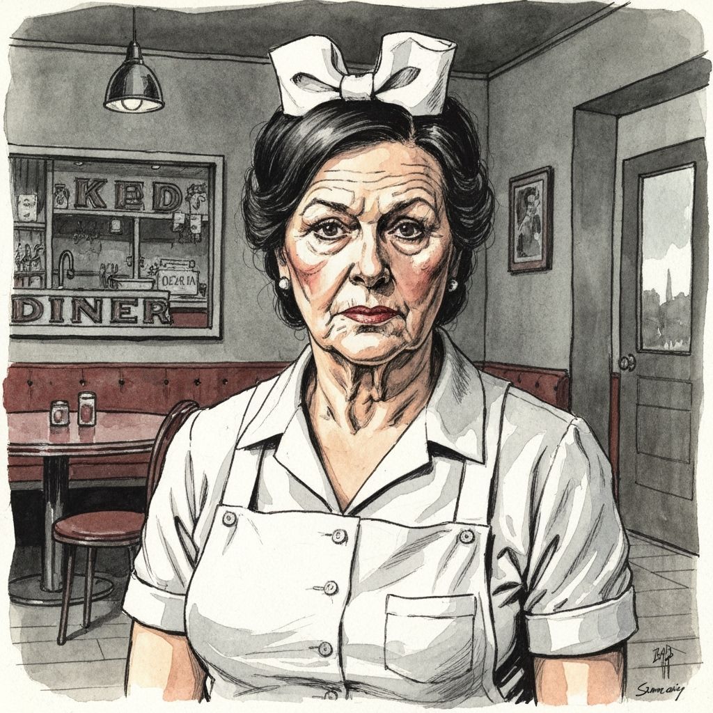 This image features a tired old waitress in a dimly lit diner, rendered in a concept art style with watercolor and ink influences.
