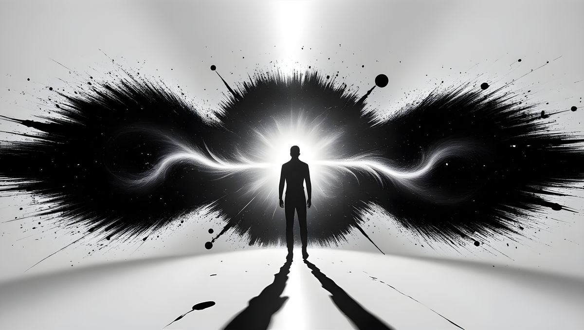 This image shows a breathtaking, ultra-detailed black and white ink silhouette of a cosmic journey through the universe at incredible speed, featuring intricate shading and lighting effects reminiscent of 3D and Bauhaus styles.