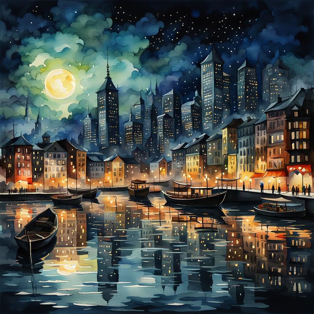 This image shows a vibrant cityscape reflected in water at night. The watercolor painting captures an epic, cinematic atmosphere with intricate details and a dramatic, maximalist style.
