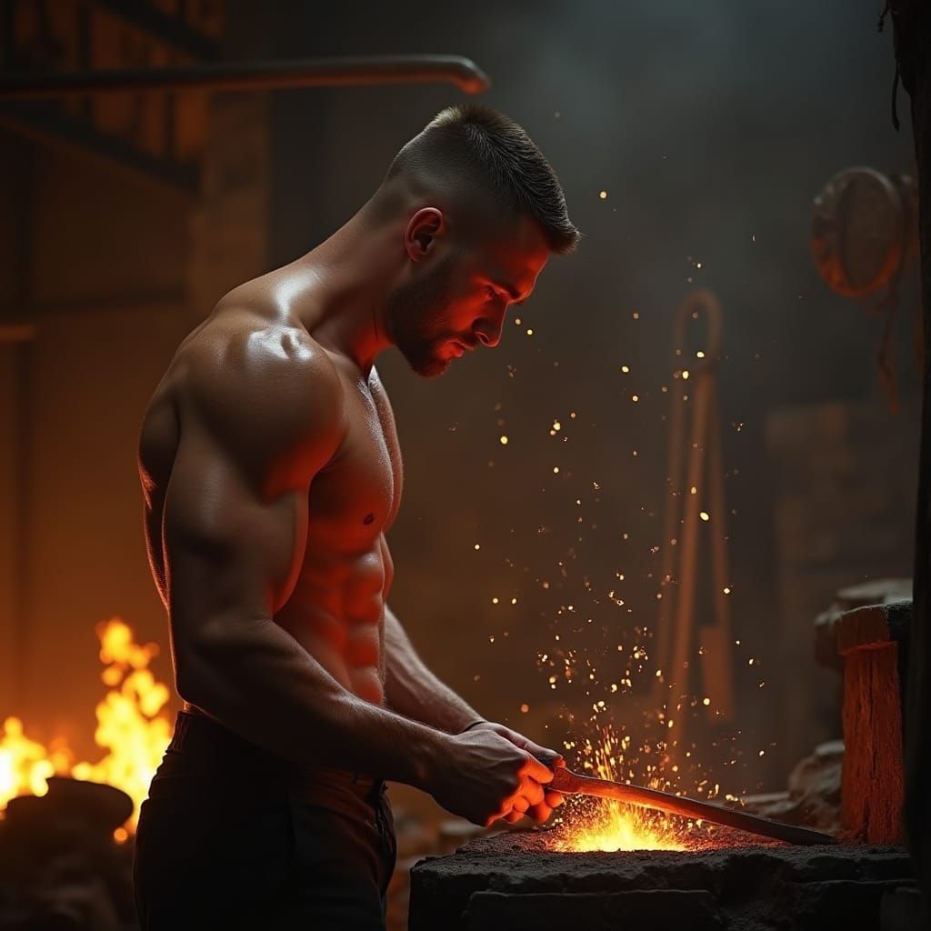 A dramatic image of a muscular blacksmith forging a glowing sword in his workshop. The scene features cinematic lighting, sparks, embers, and a gritty, film-like aesthetic.