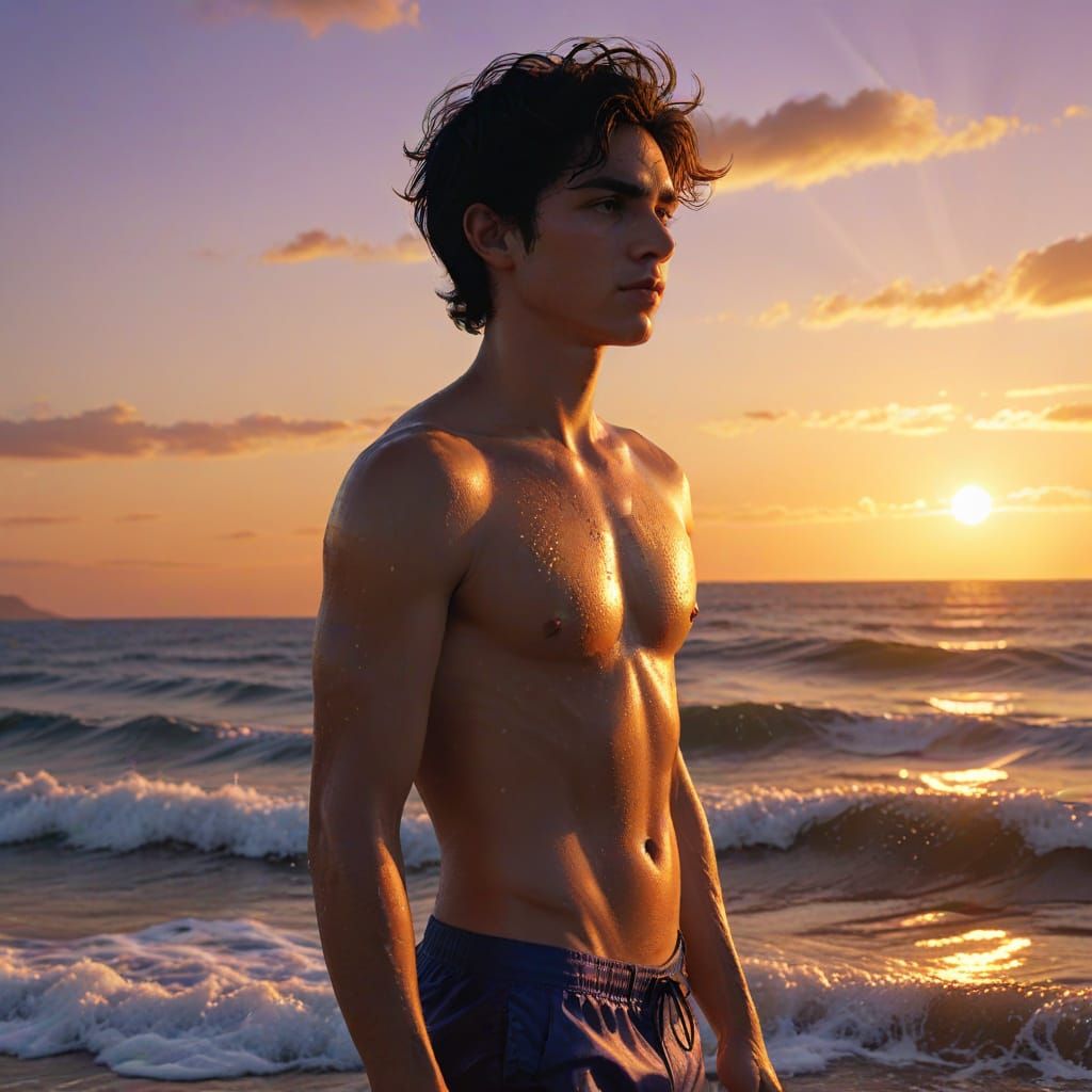 This image shows a teenage boy in blue swimming pants by the ocean at sunset. The scene features windswept hair, ocean spray, and a vibrant sky in warm golden hour lighting, captured in photorealistic detail.