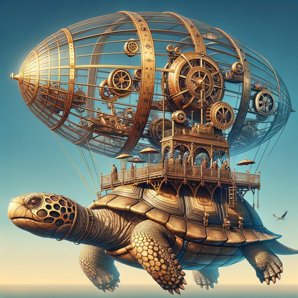 This image features a majestic steampunk-inspired hot air balloon shaped like a giant tortoise, with intricate brass details and a Victorian-era observation deck, evoking the elegance of Art Nouveau and the innovative futurism of Jules Verne's literature, rendered in detailed matte painting style with wa...
