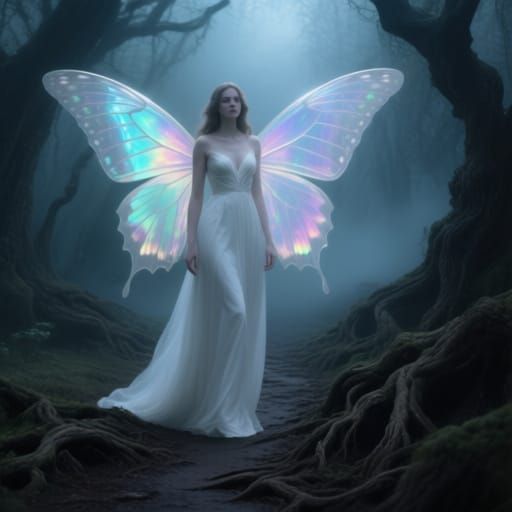 This image shows a beautiful woman with large, translucent, iridescent butterfly wings, wearing a white gown, standing on a root-covered path in a dark, misty fantasy forest. Features an ethereal, magical glow and cool, diffused lighting.