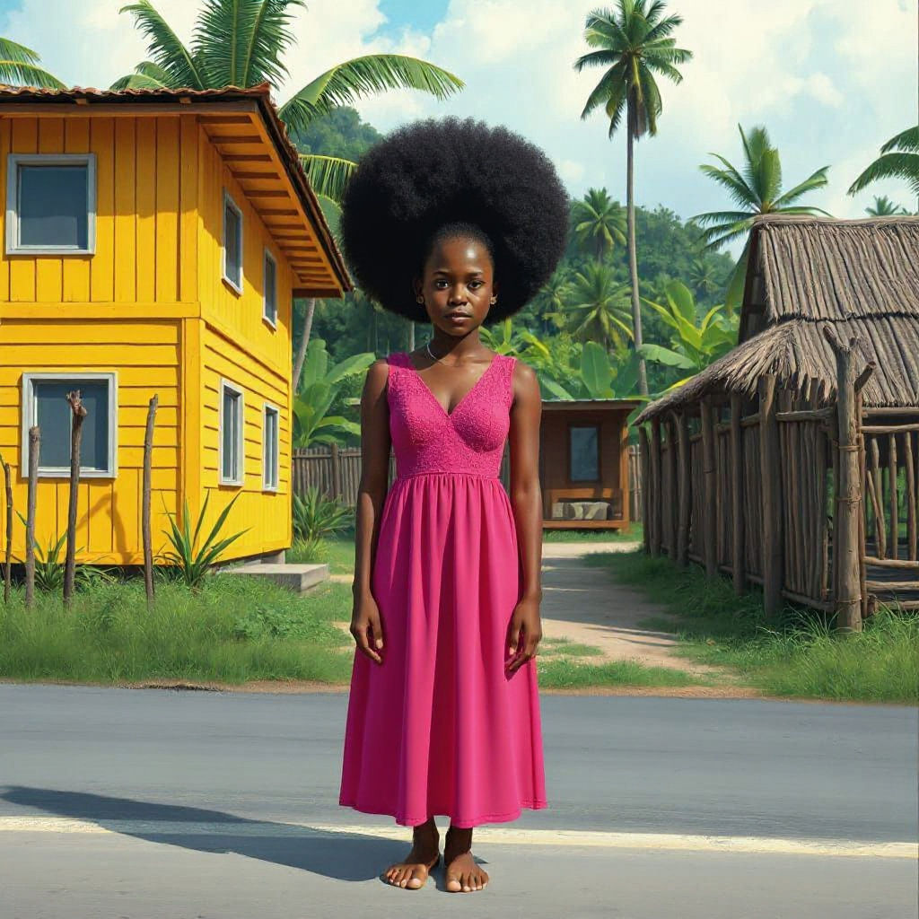 This image shows a modernized yellow wooden house on posts, reflected in someone's eyes. A young Melanesian woman with an afro stands barefoot nearby in this digital artwork.