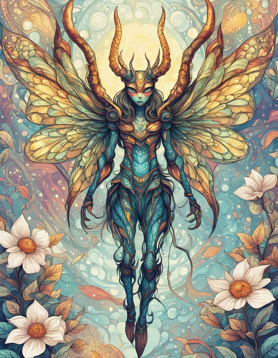 A vibrant manga illustration of an insectoid fairy creature. The close-up shot features glowing wings, large eyes, flowing hair, and detailed patterns, rendered in a psychedelic, neon-lit aesthetic.