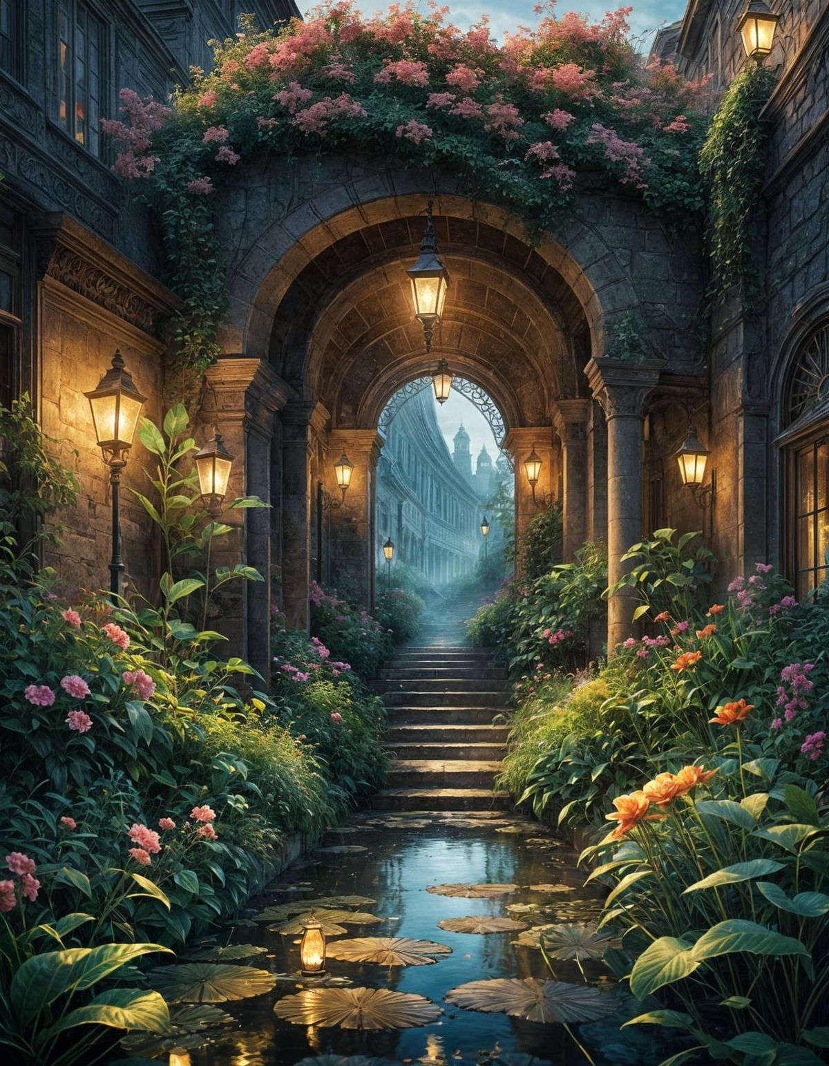 This image showcases elegantly lit water lilies with a painterly and atmospheric feel, rendered with glowing, elaborate detail.