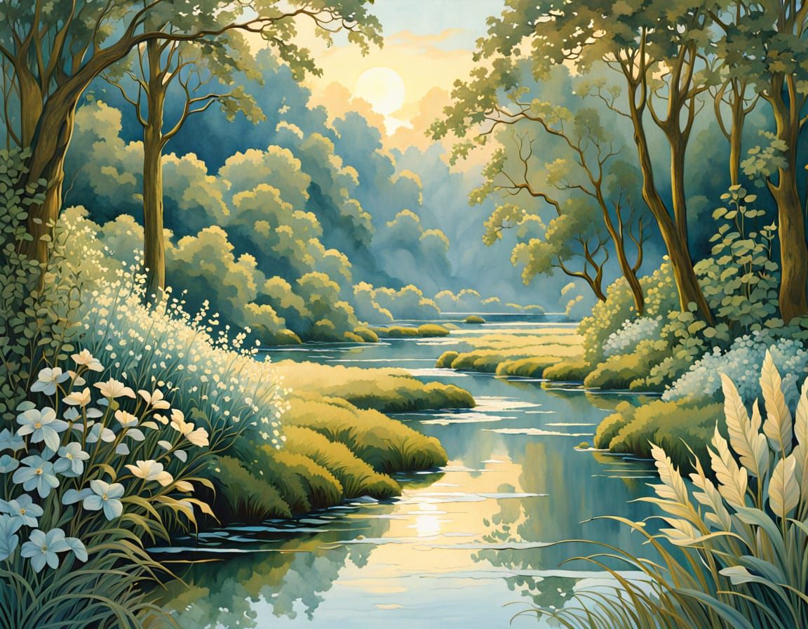 This serene image shows a middle-aged man standing by a river in a park, surrounded by delicate floral motifs and soft, dreamy lighting. Inspired by the Art Nouveau style, this painting features a gentle, feathery texture and a nature-inspired color palette with earthy tones and sky blues.