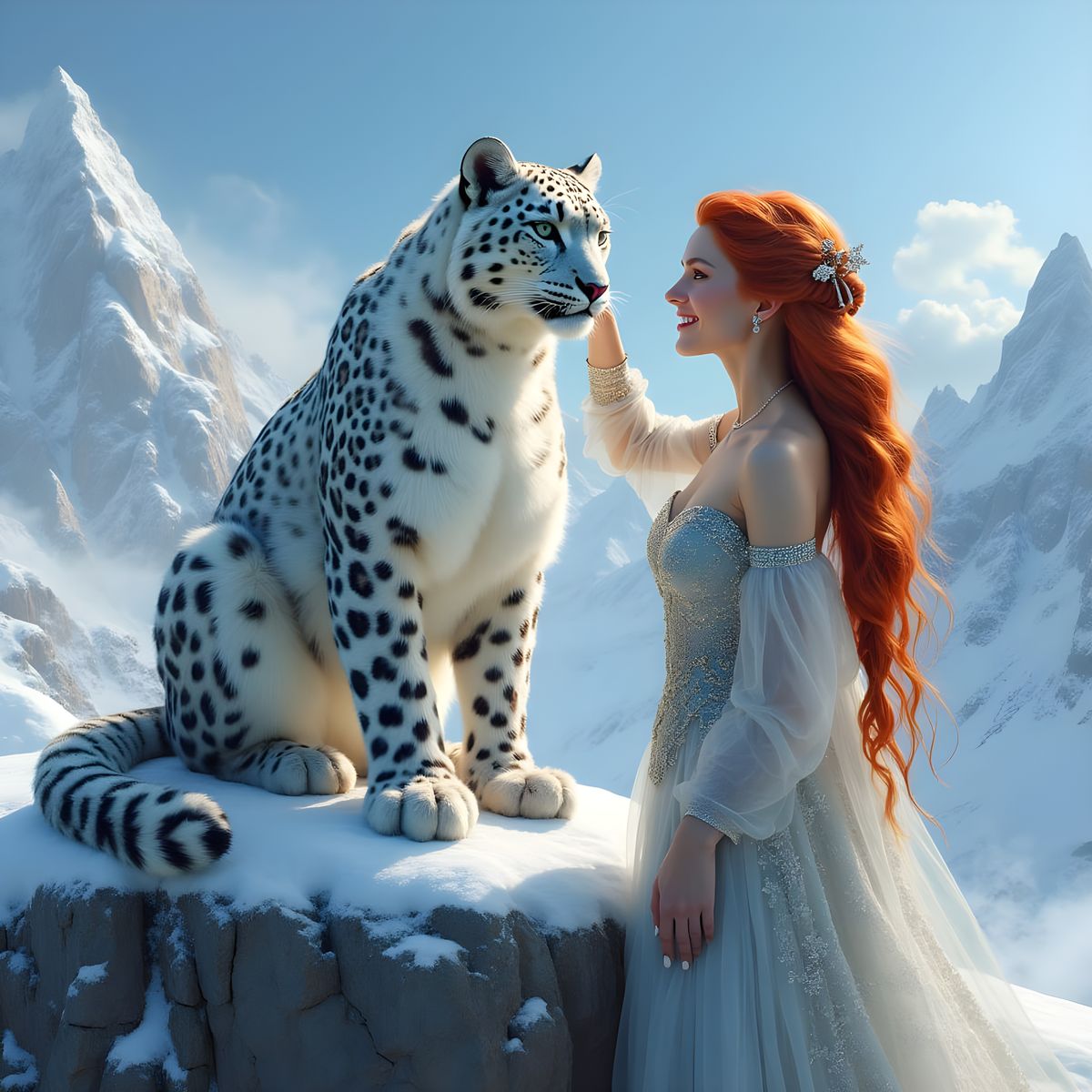 A hyperrealistic image of a snow leopard on a mountain peak, with a red-haired elven queen standing beside it. The queen wears a shimmering silver gown. The background shows snow-covered peaks and a clear sky.