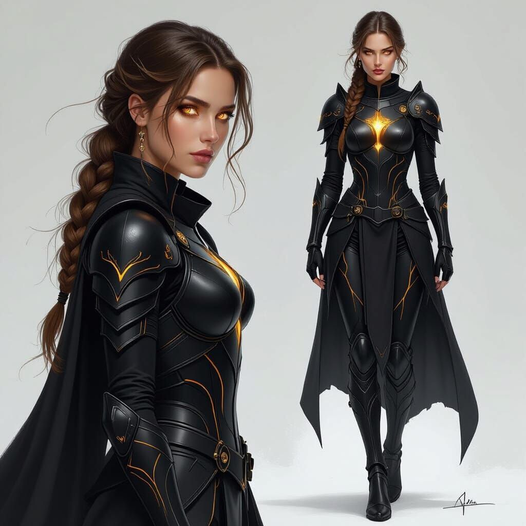 A digital painting of a warrior woman in dark armor. The figure features intricate gold accents, windswept braided hair, and glowing golden eyes, rendered with a vibrant, futuristic aesthetic.