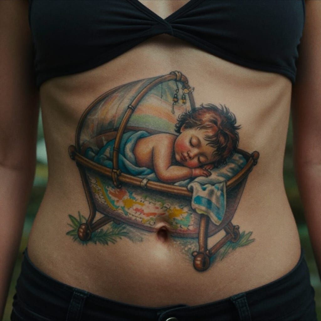 A close-up image of a vibrant tattoo on a woman's stomach, showing a sleeping child in a cradle. The artwork features soft colors, realistic shading, and cinematic lighting for a serene, masterpiece quality.