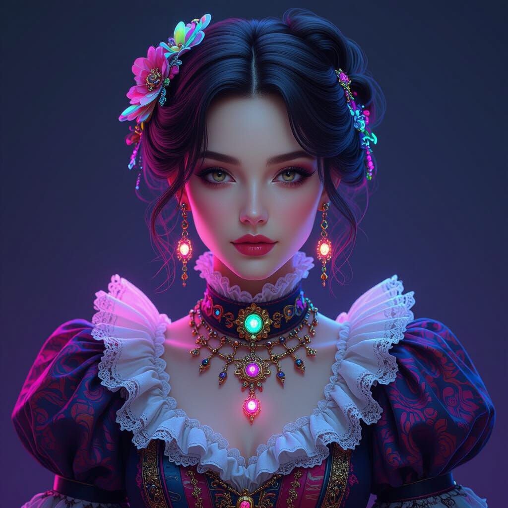 This image shows a hyperrealistic portrait of a woman in detailed Victorian-inspired clothing and futuristic jewelry. The artwork features 3D anime art elements and breathtaking textures, rendered with ultrafine detail in 8k resolution.