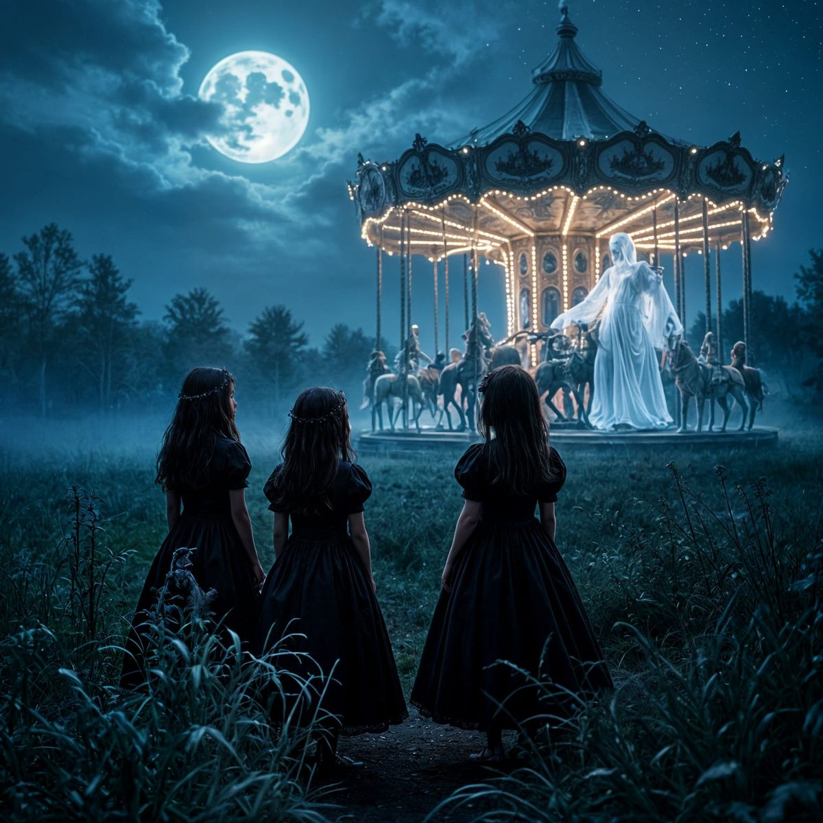 This hyper-realistic image shows two young girls in gothic dresses observing a spectral carousel in a moonlit field. An ethereal figure beckons them towards the decaying ride, creating an eerie atmosphere with cinematic lighting and volumetric fog.